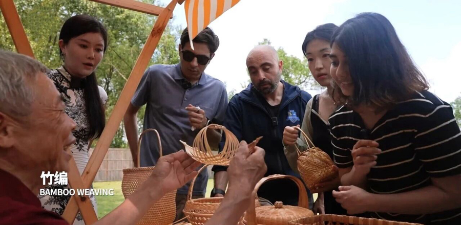 稻穗低垂、锣鼓声声,活动在国家级非遗舞草龙表演中拉开序幕,现场气氛热烈。松江筘布、竹编、叶榭软糕、青龙饺、张泽羊肉等非遗项目在乡村小院一一呈现,让外国友人大饱眼福。在筘布摊位前,工作人员娓娓道来叶榭筘布的悠久历史与名字由来,引得“洋朋友”们兴致盎然。木火慢炖两小时的张泽羊肉香气四溢,让大家赞不绝口。