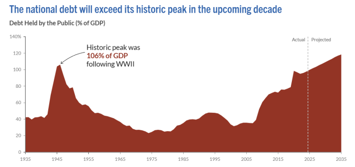 2024年,公众持有的美国联邦政府债务与GDP之比达98%。图片来源:彼得·彼得森基金会网站