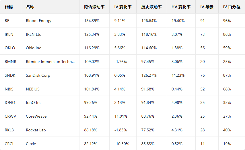 美股引申波动幅度排行榜前十(标的市值>100亿美元,且期权成交量>10万美元)