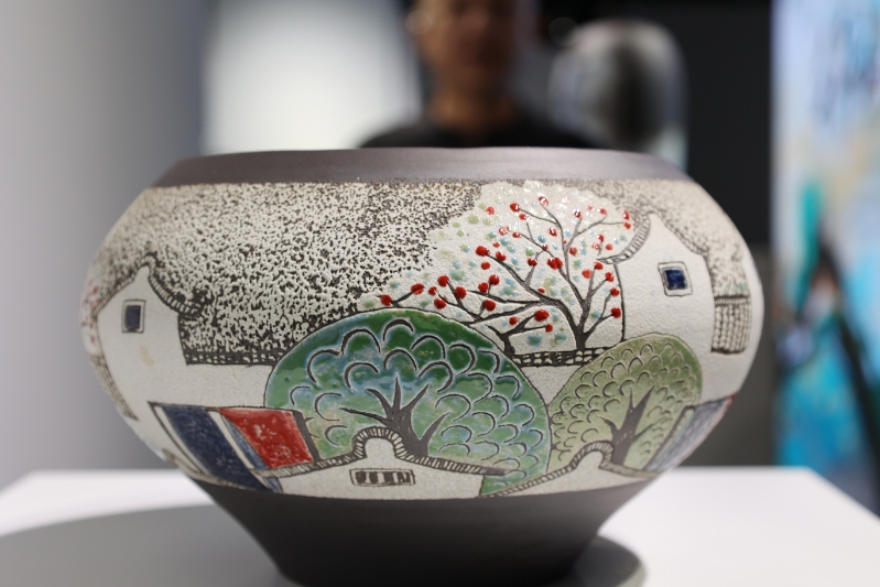 许育梅的作品创新性地植入了金山农民画的经典元素——将江南黑瓦白墙、稻浪翻涌等乡土意象,通过陶瓷特有的绘画技法进行转译,颇具亮点。