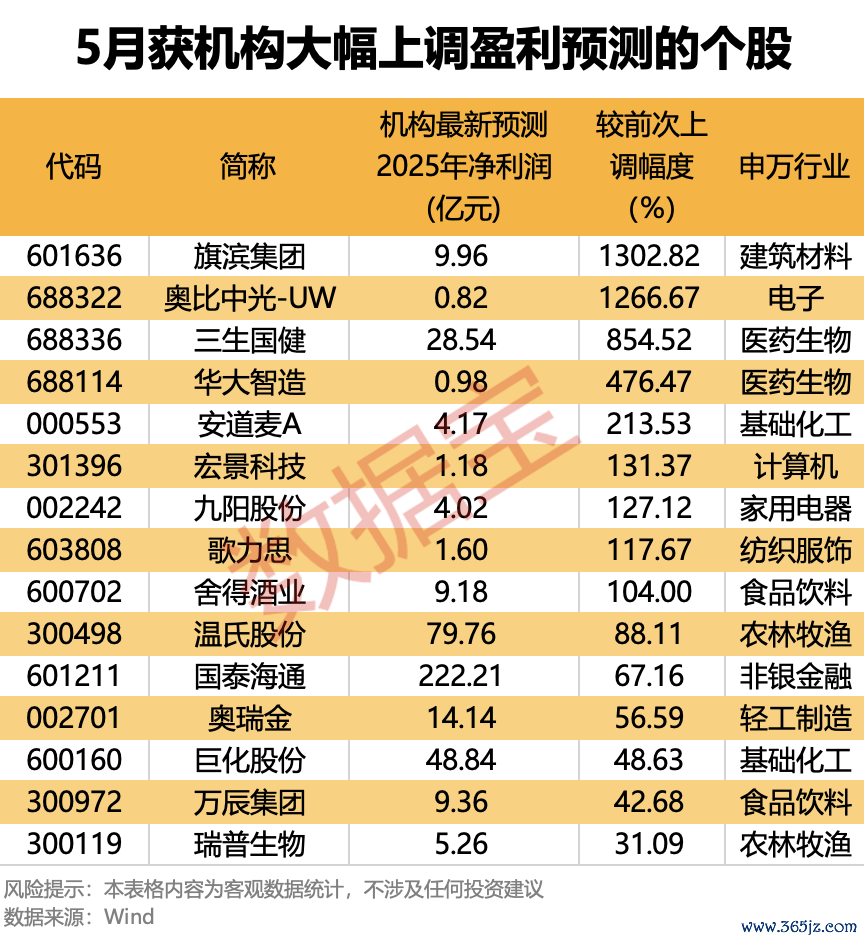 据数据宝统计,截至5月30日,在机构前次预测(2025年以来的预测)净利润为正的个股中,有15股5月获机构最新预测2025年净利润上调幅度超30%(被多家机构同时上调净利润预测的个股只保留调整幅度最大的样本)。